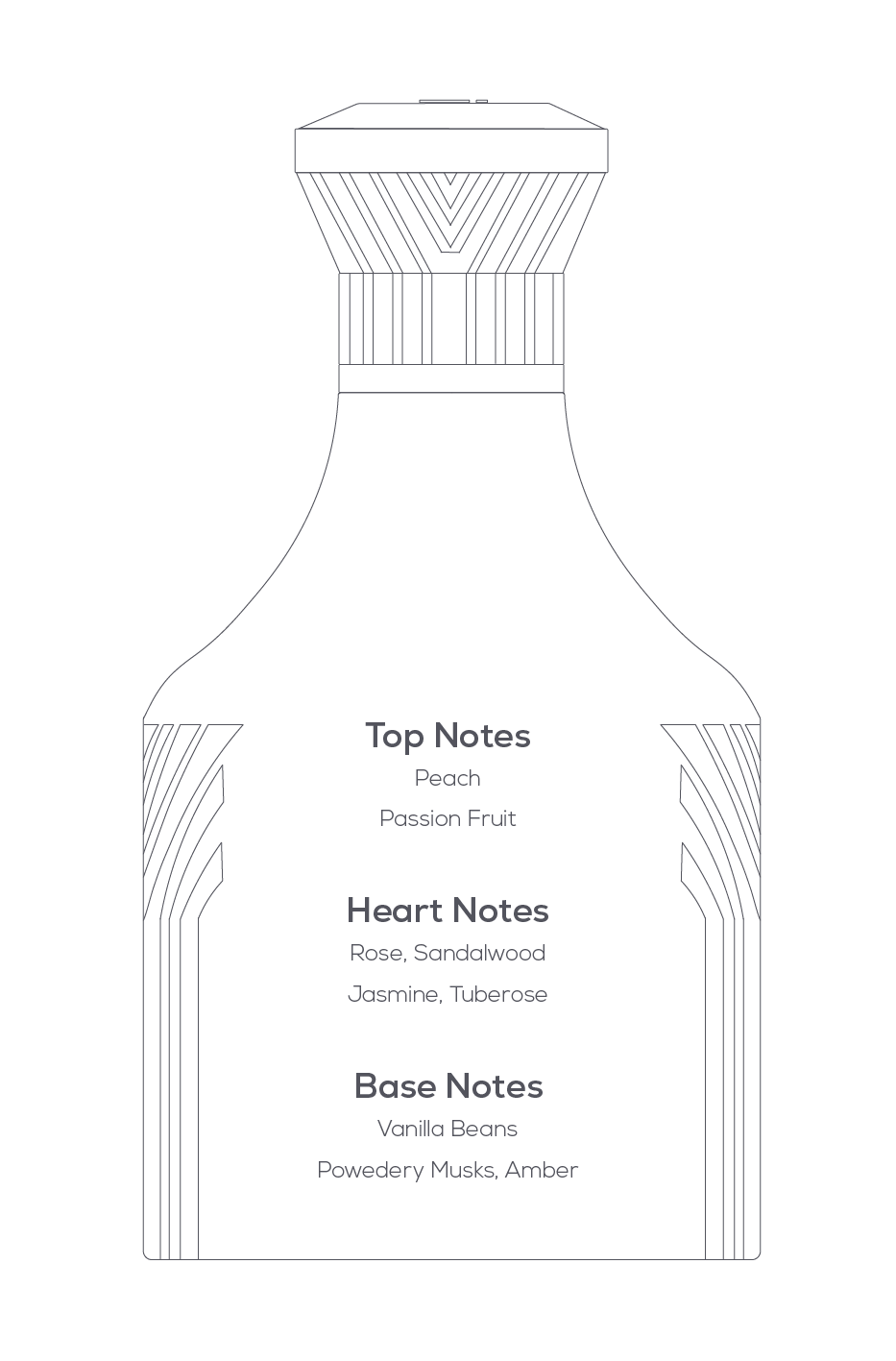 沉浸在令人安心的果香花香中,其清新的百香果和桃子顶调引领着夜来香、茉莉、玫瑰和柔滑檀香木的明亮心调。粉质麝香、琥珀和香草基调增添温暖,营造出令人无法抗拒的氛围,让您沉醉在纯粹的魅力之中。
