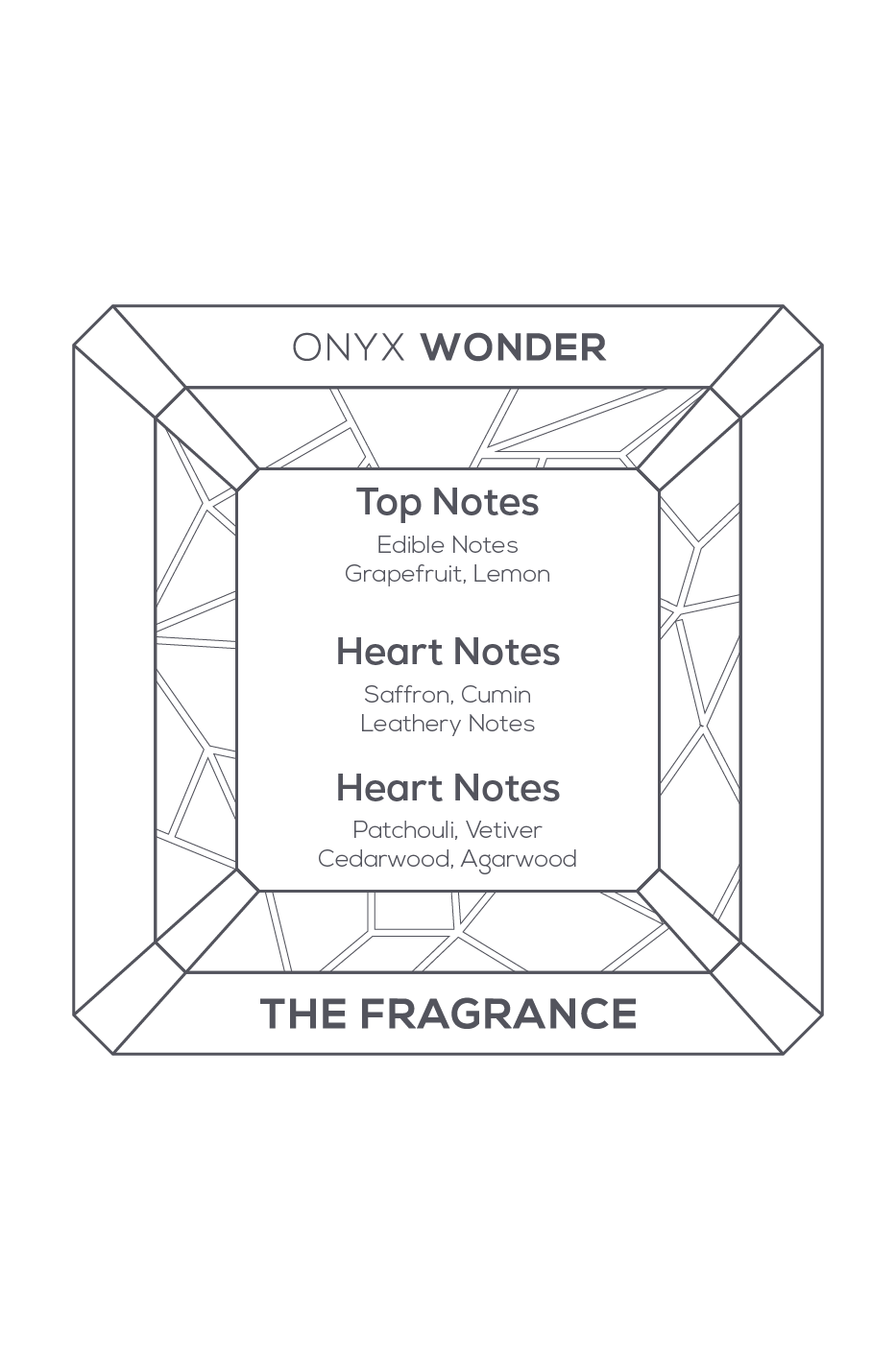 “Onyx Wonder”是一款复杂的香氛,其层层展开的香调引人入胜,令人难以抗拒。这款浓郁的香氛以葡萄柚和柠檬的柑橘组合轻柔开场,并融入了一系列神秘的食用香调,使其更显柔和。中调则充满爆发力,蕴含着藏红花和小茴香调味的皮革香调。所有这些香调都沉淀在空灵的香根草和甜美的广藿香木质基调之上,并由沉香和雪松的深沉浓郁香气加以强化。