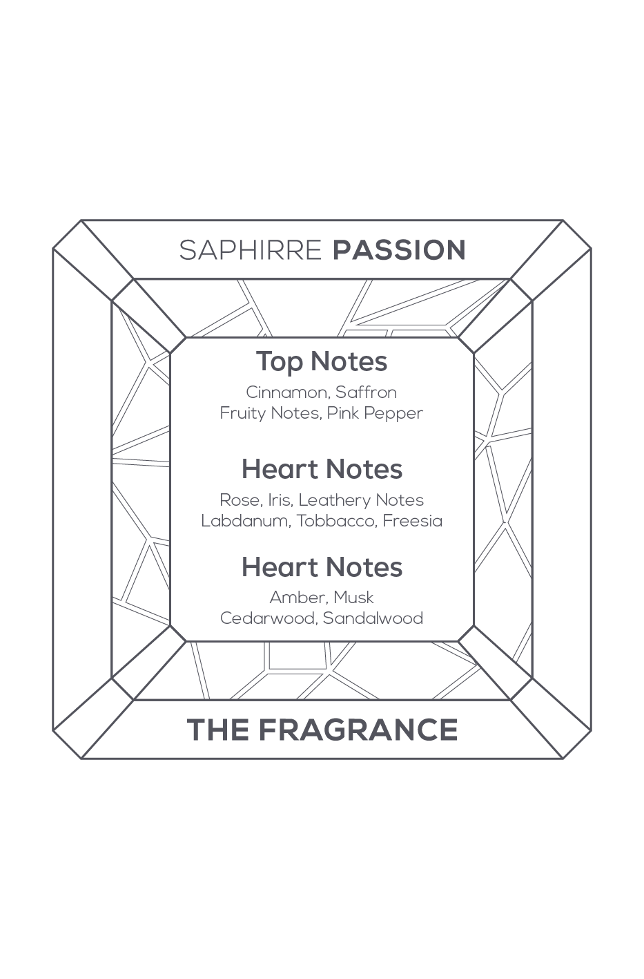 A deep oriental spicy fragrance, with a head of exuberant bergamot, fruity, and spicy notes of Pink Pepper, Saffron, Cinnamon, & Cardamom. The heart is floral and woody, with sweet Freesia, rose, creamy Iris, Labdanum, and dark Tobacco and leather notes. The base of Saphirre Passion is precious, with twin amber and musk, sweet Vanilla and Tonka Beans, and serious Cedarwood and Sandalwood notes.